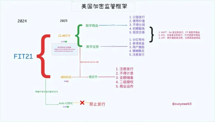 從邊緣走向中心,終至聚光燈下。 撰文:佐爺 Crypto Week 三連擊,天才法案專管穩定幣,已經成爲法律,反 CBDC 法案和 CLARITY 清晰法案還在立法流程中。 和天才法案不同,CLARITY 針對加密的基礎定義和權限分配,尤其是公鏈、DeFi、代幣發行,以及 SEC 和 CFTC 的權力和職責,並且其和 2024 年 FIT21 法案緊密聯繫。 圖片說明:美國加密監管框架,圖片來源:...